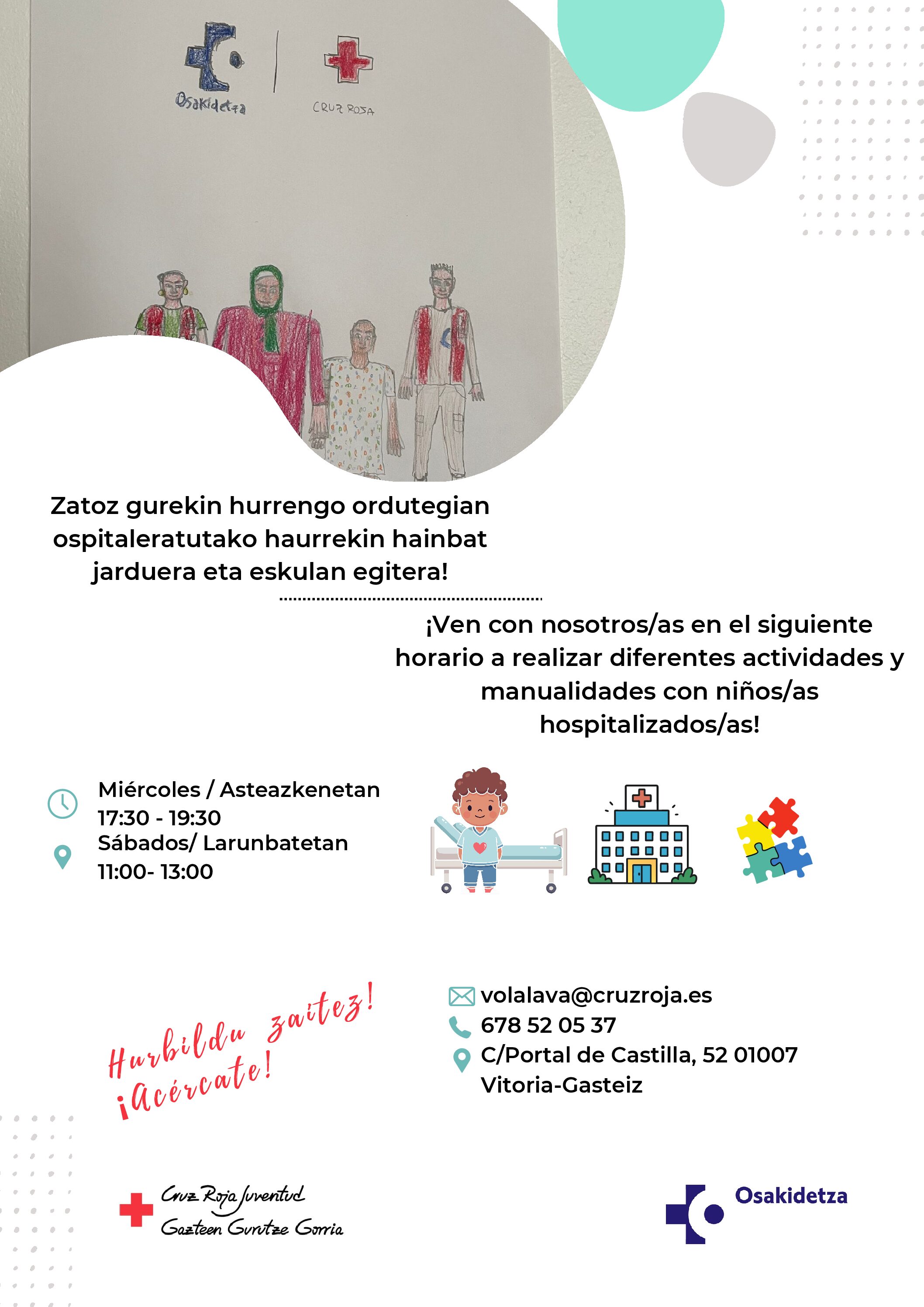 Descripción del proyecto: ¿Tienes disponibilidad, ganas de compartir tiempo con peques y hacer su estancia más amena en el hospital de Txagorritxu? Horarios y fechas: